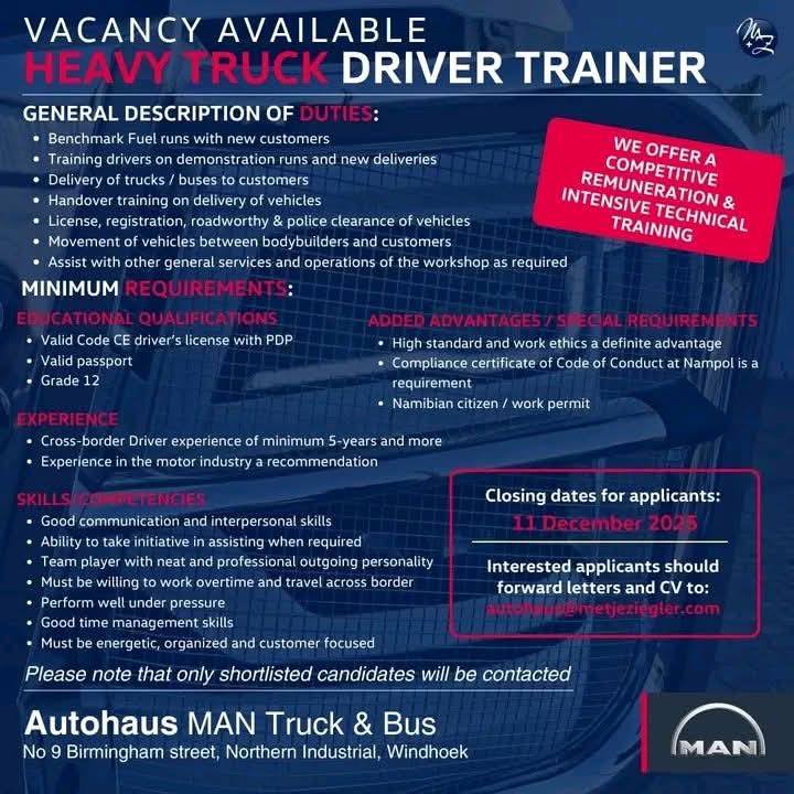 Don’t miss the chance to join one of Namibia’s top companies and take a step toward a successful career with Autohaus Truck & Bus!