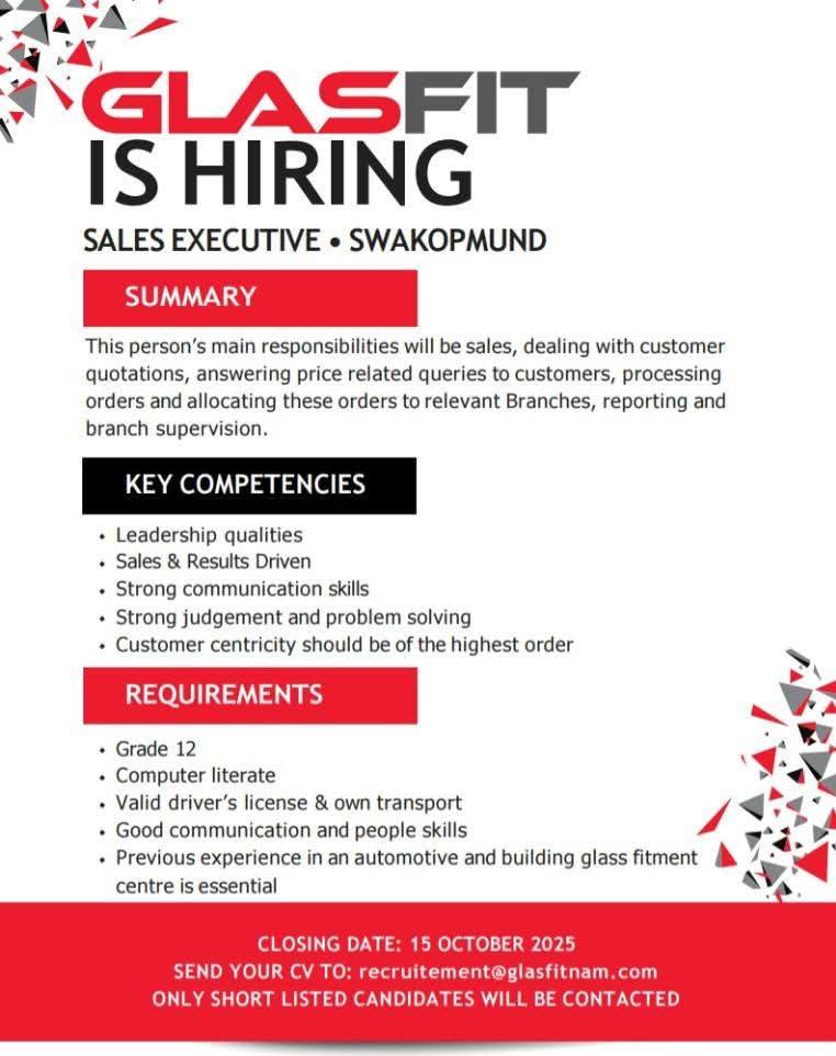 Sales Executive | Swakopmund, Erongo, Namibia | 15 october 2025 |