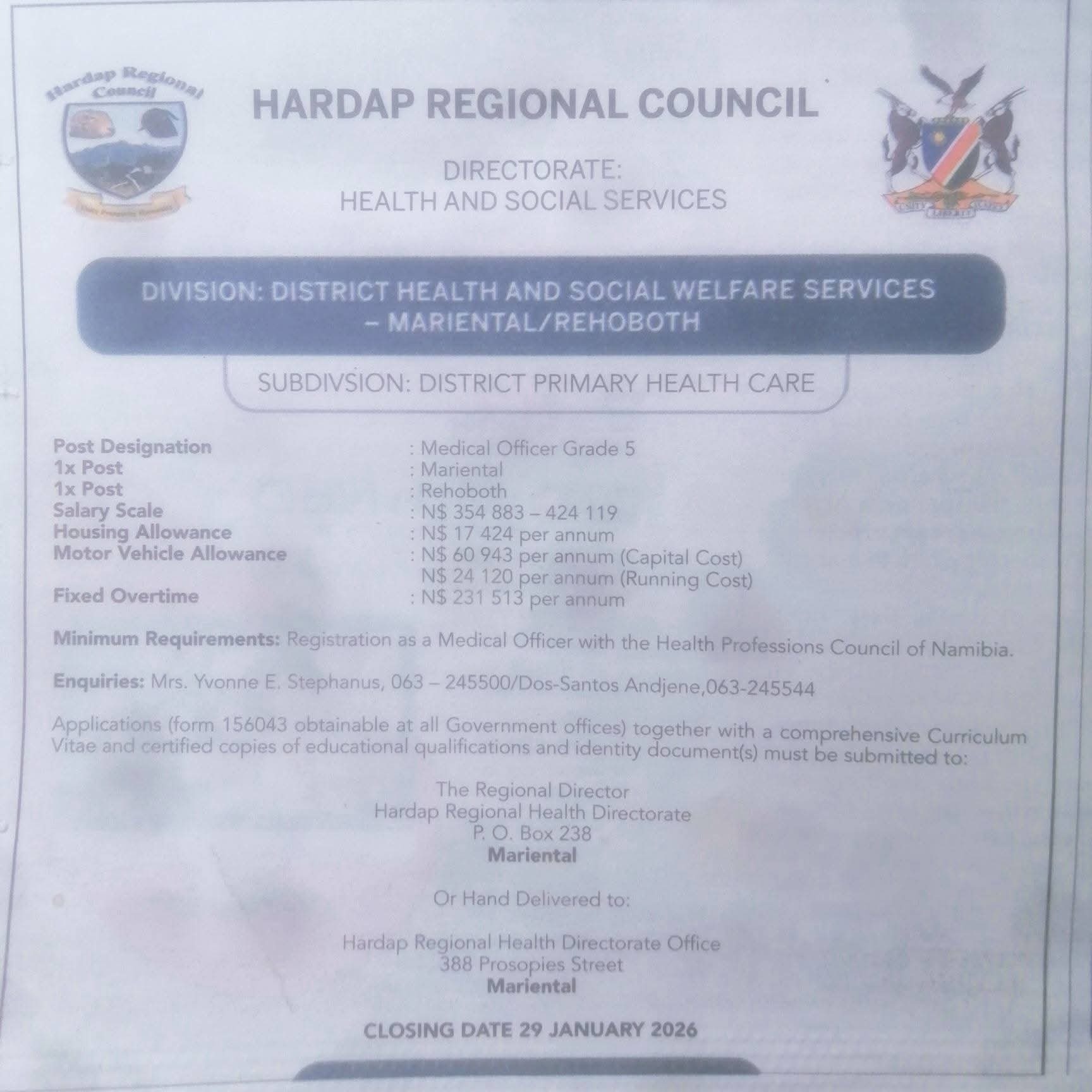 Hardap Regional Council Namibia Vacancies 2026 : Apply Now for Medical Officer Grade 5 Job Opportunities in Namibia