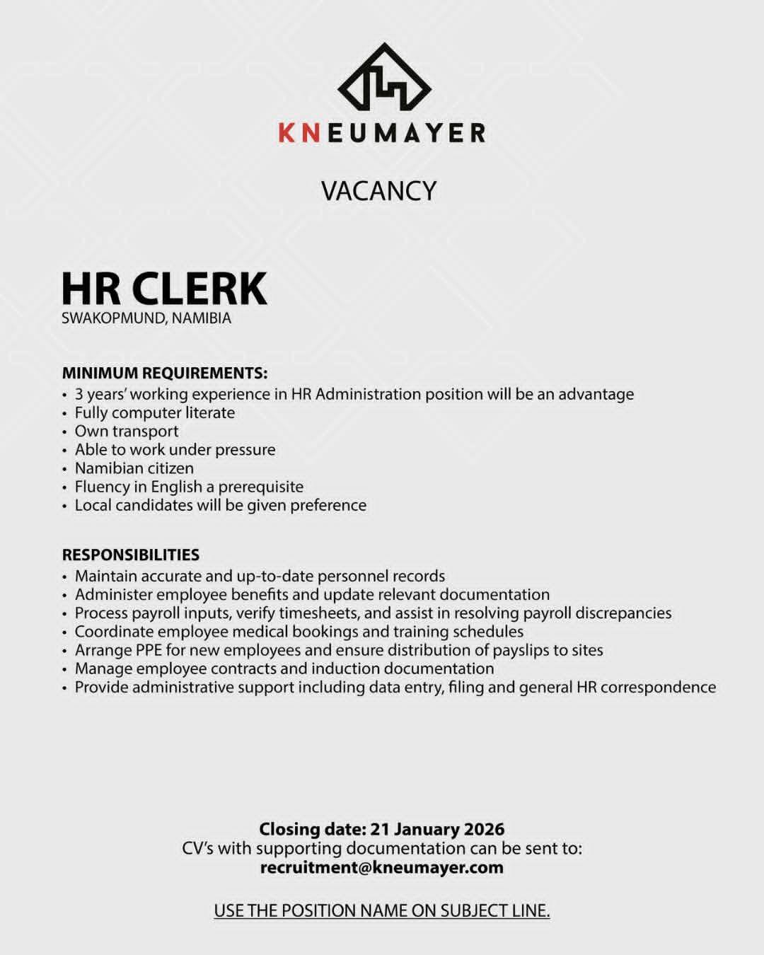 | HR Clerk | Swakopmund, Erongo, Namibia | 21 January 2026 |