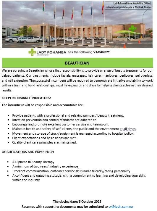 How to Apply for Beautician Jobs at Lady Pohamba Private Hospital 2025