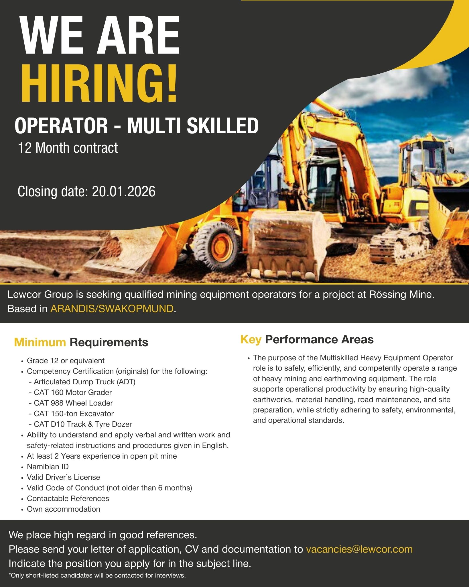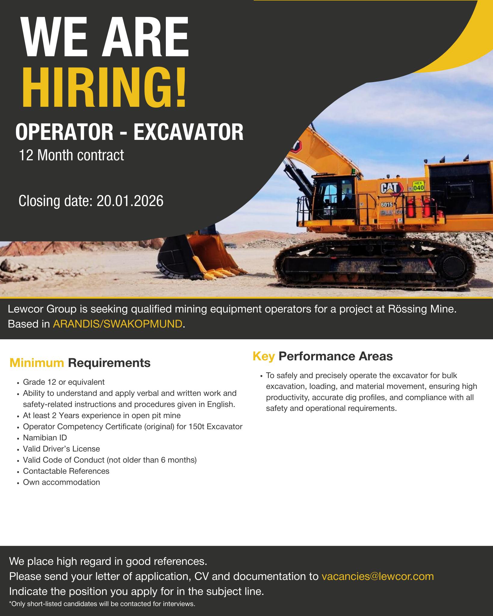 | Operator – Excavator (12-month contract) | Oranjemund, Karas, Namibia | 20 January 2026 |