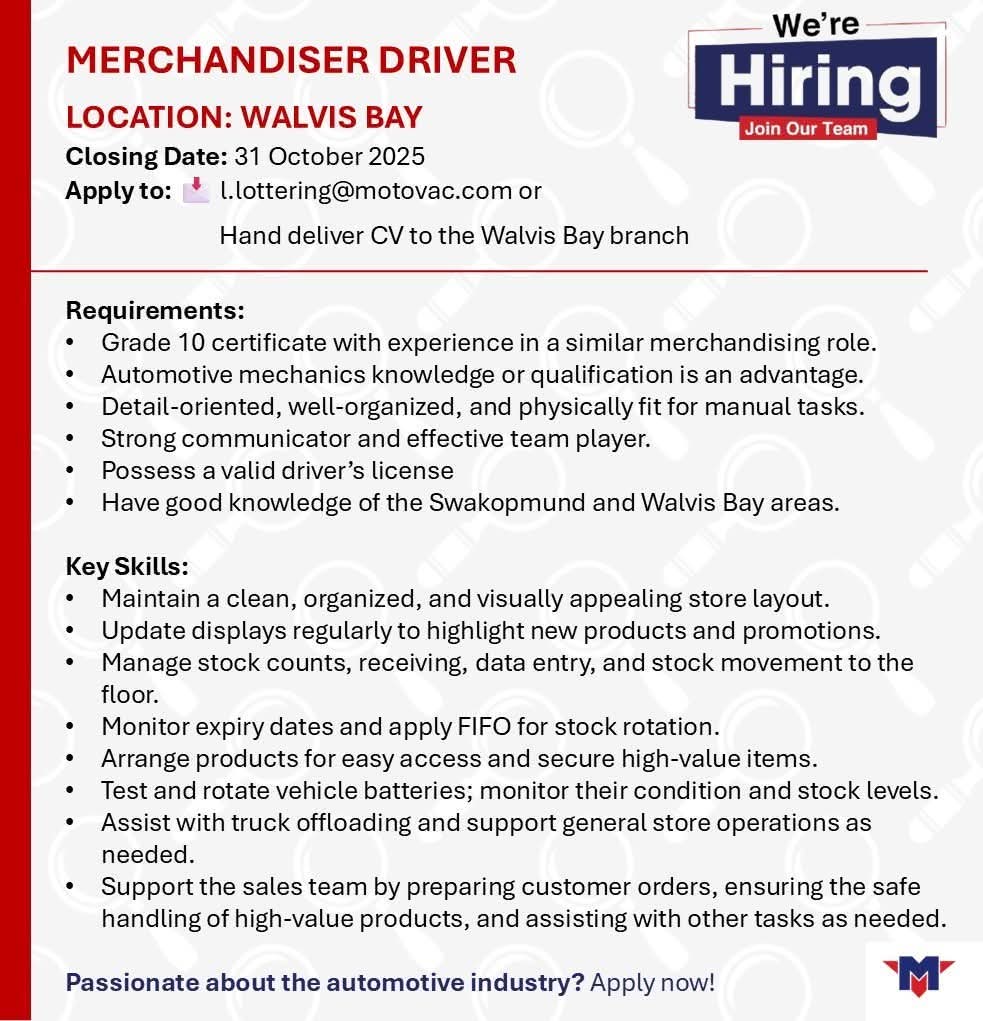 | Merchandiser Driver | Windhoek, Khomas, Namibia | 31 October 2025 |