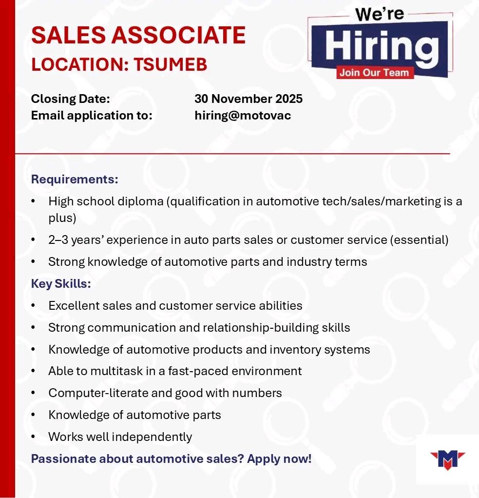 | Sales Associate | Tsumeb, Oshikoto, Namibia | 30 October 2025 |