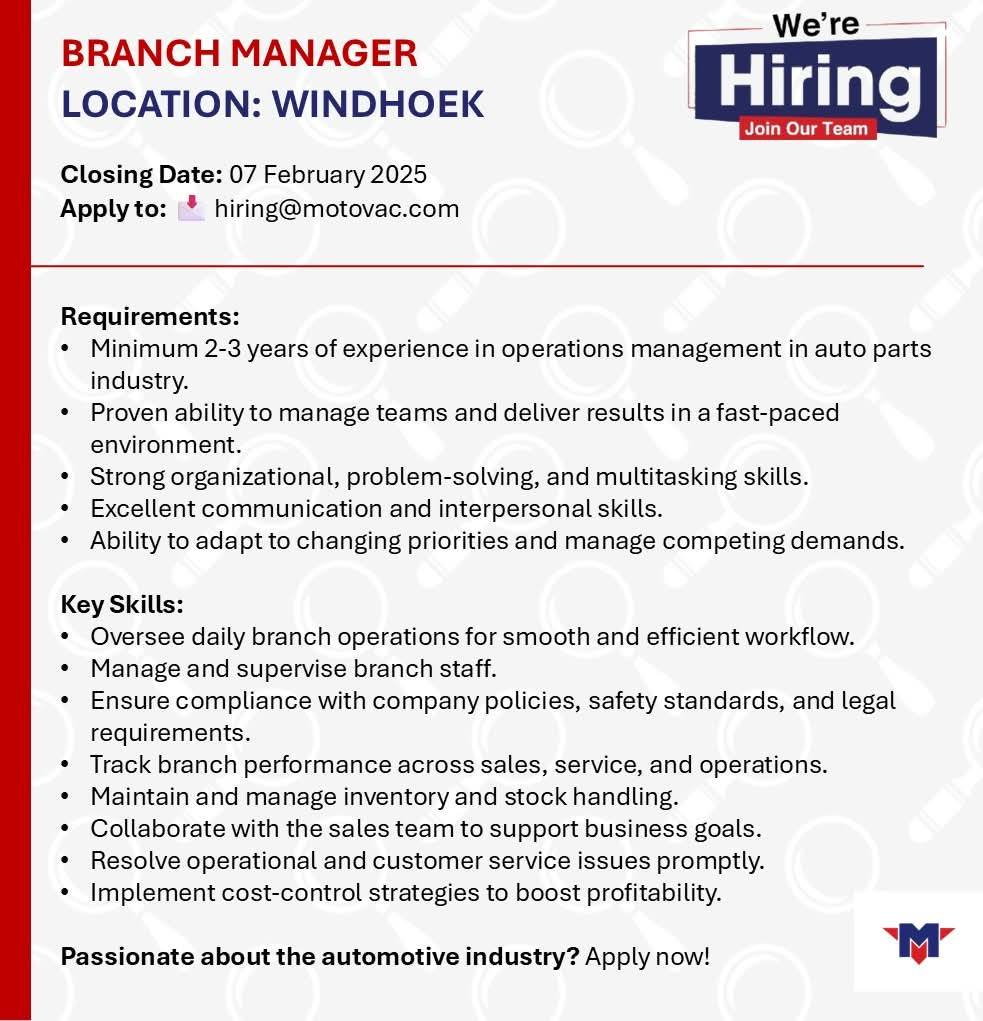 Don’t miss the chance to join one of Namibia’s top companies and take a step toward a successful career with Motovac!