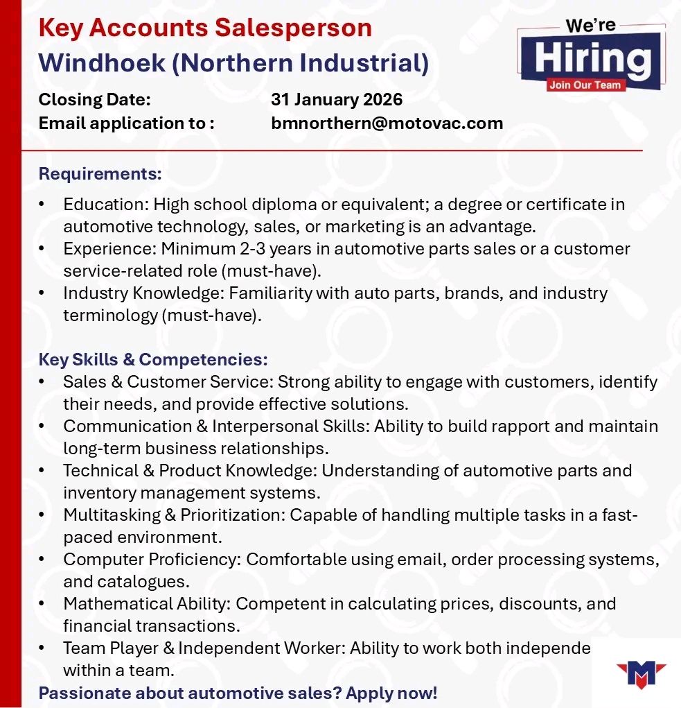 | Key Accounts Salesperson | Windhoek (Northern Industrial), Khomas, Namibia | 31 January 2026 |