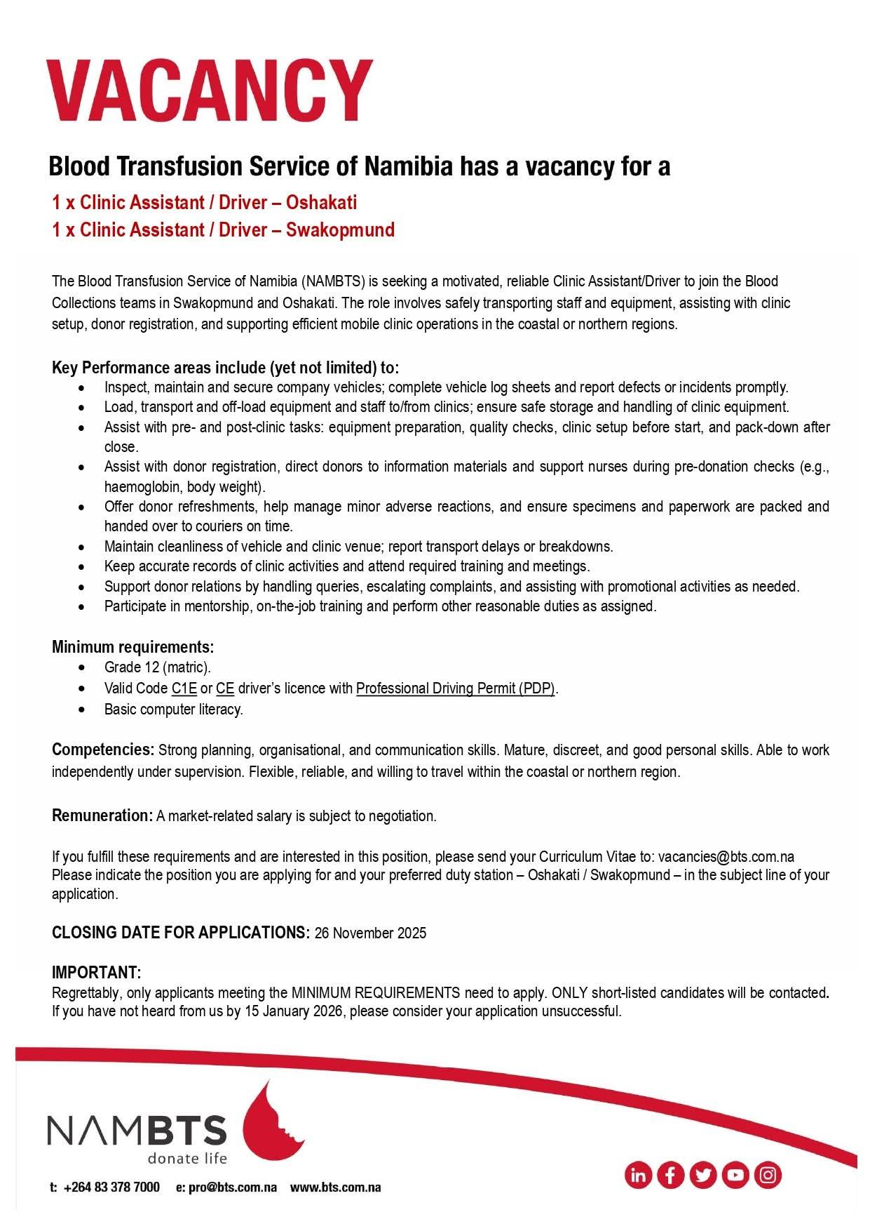 | X2 Clinic Assistant/Driver | Windhoek, Khomas, Namibia | 26 November 2025 |