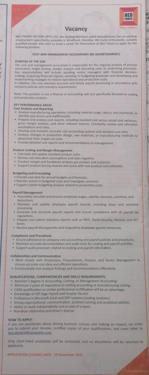 | Cost and Management Accountant | Windhoek, Khomas, Namibia | 10 November 2025 |