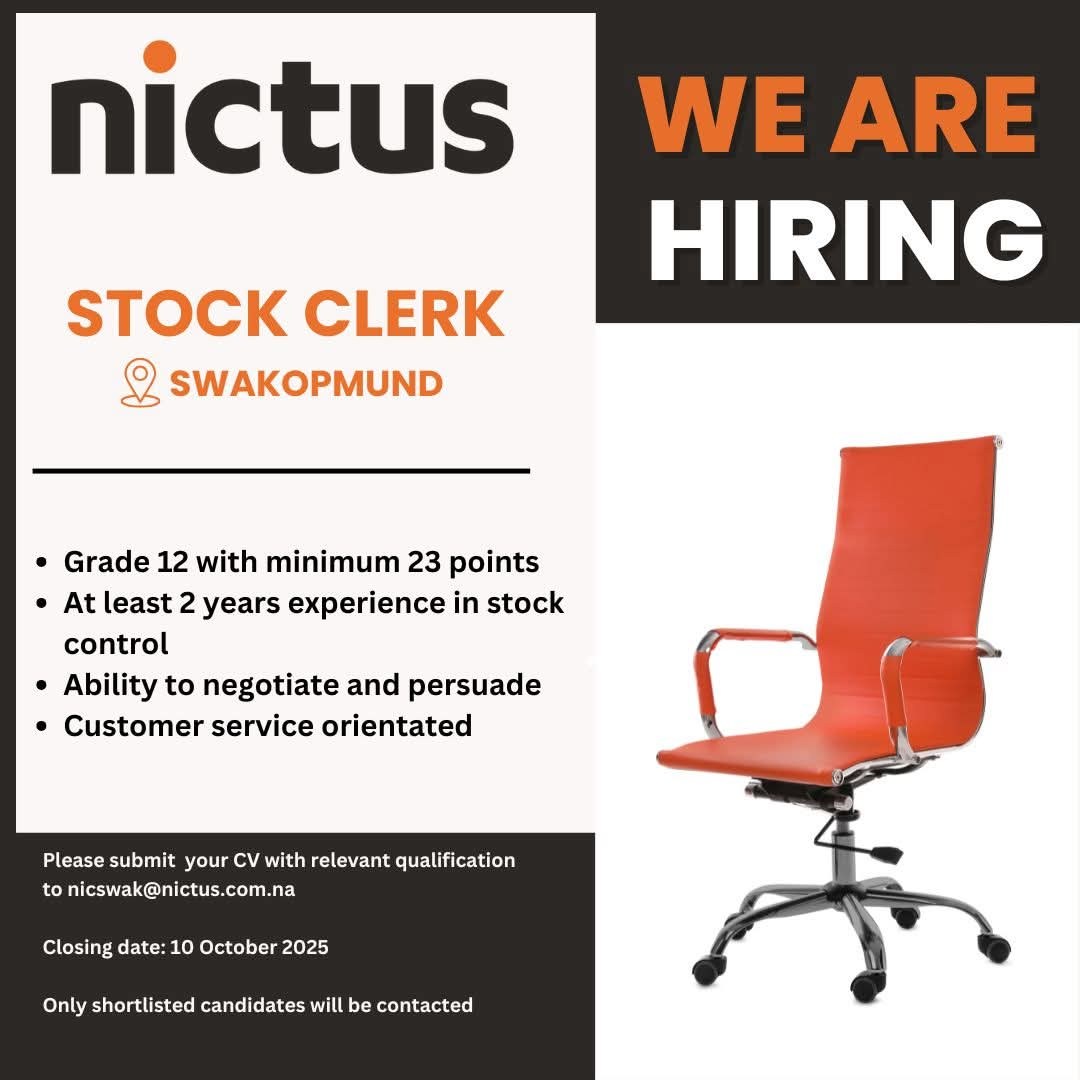 | Stock Clerk | Windhoek, Khomas, Namibia | 10 October 2025 |