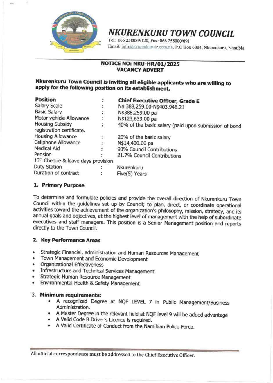 Chief Executive Officer, Grade E Nkurenkuru, Kavango West, Namibia 03 November 2025