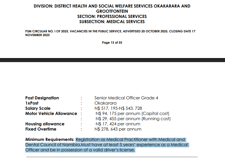 | Senior Medical Officer Grade 4 | Okakarara, Namibia | 17 November 2025 |