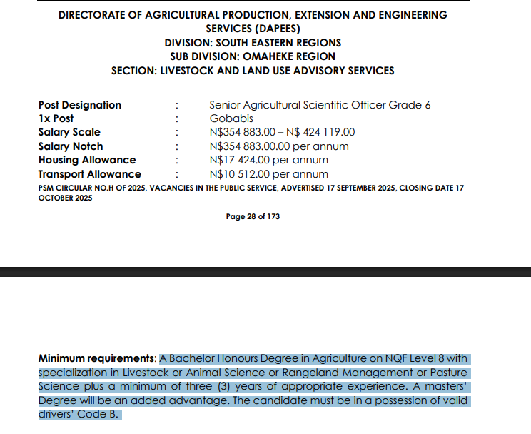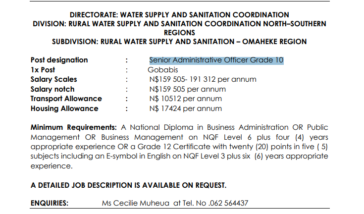 | Senior Administrative Officer Grade 10 | Gobabis, Omaheke Region, Namibia | 17 October 2025 |