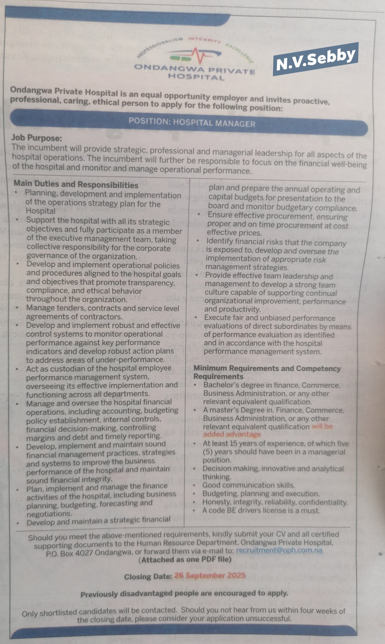 | Hospital Manager | Ondangwa, Oshana, Namibia | 26 September 2025 |