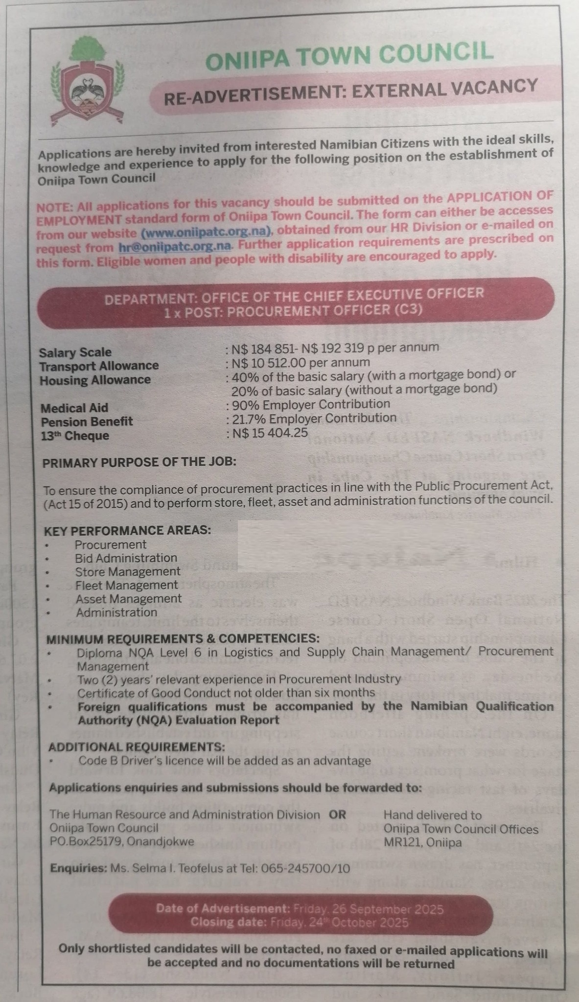 For any queries or assistance, candidates can contact Oniipa Town Council’s HR team: