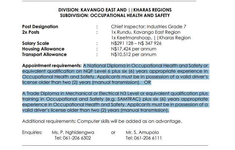| Chief Inspector: Industries Grade 7 | Rundu, Namibia | 17 October 2025 |