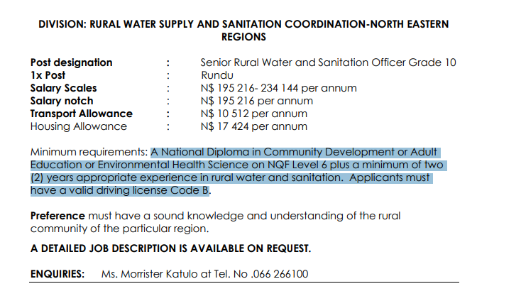 | Senior Rural Water and Sanitation Officer Grade 10 | Rundu, Namibia | 17 October 2025 |