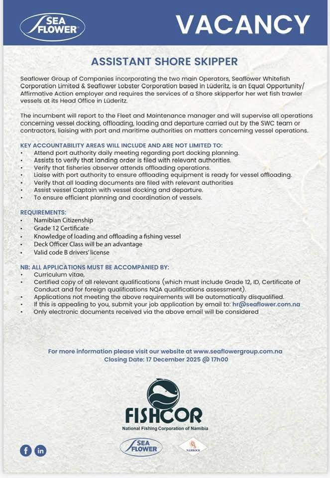 Sea Flower Group Namibia Vacancies 2026 : Apply Now for Assistant Shore Skipper Job Opportunities in Namibia